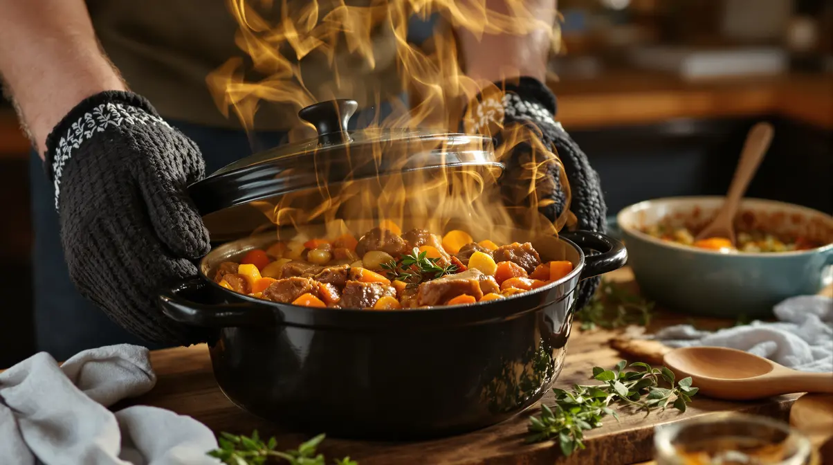 La cuisson longue au four diminue le risque d’attacher. Les viandes rendent leur jus dans le plat. Les sauces sont souvent plus onctueuses sans intervention constante.